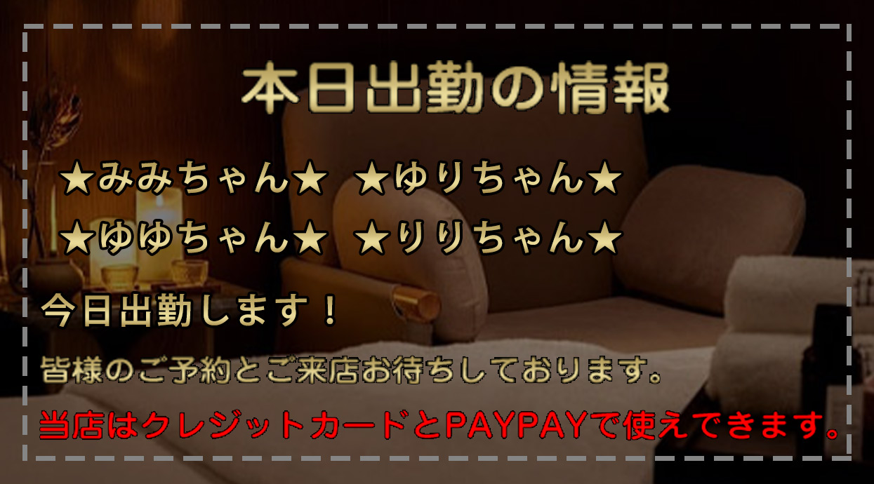 笑顔を絶やさない接客と楽しいお喋りで身体の疲れだけでなく、心の疲れもしっかり取り除ける様な、そんな時間を演出しております。素敵な可愛い貴方だけのセラピストが待っています。私たちが笑顔と楽しい時間という何物にもかえがたい心に大切なプレゼントあげますね!